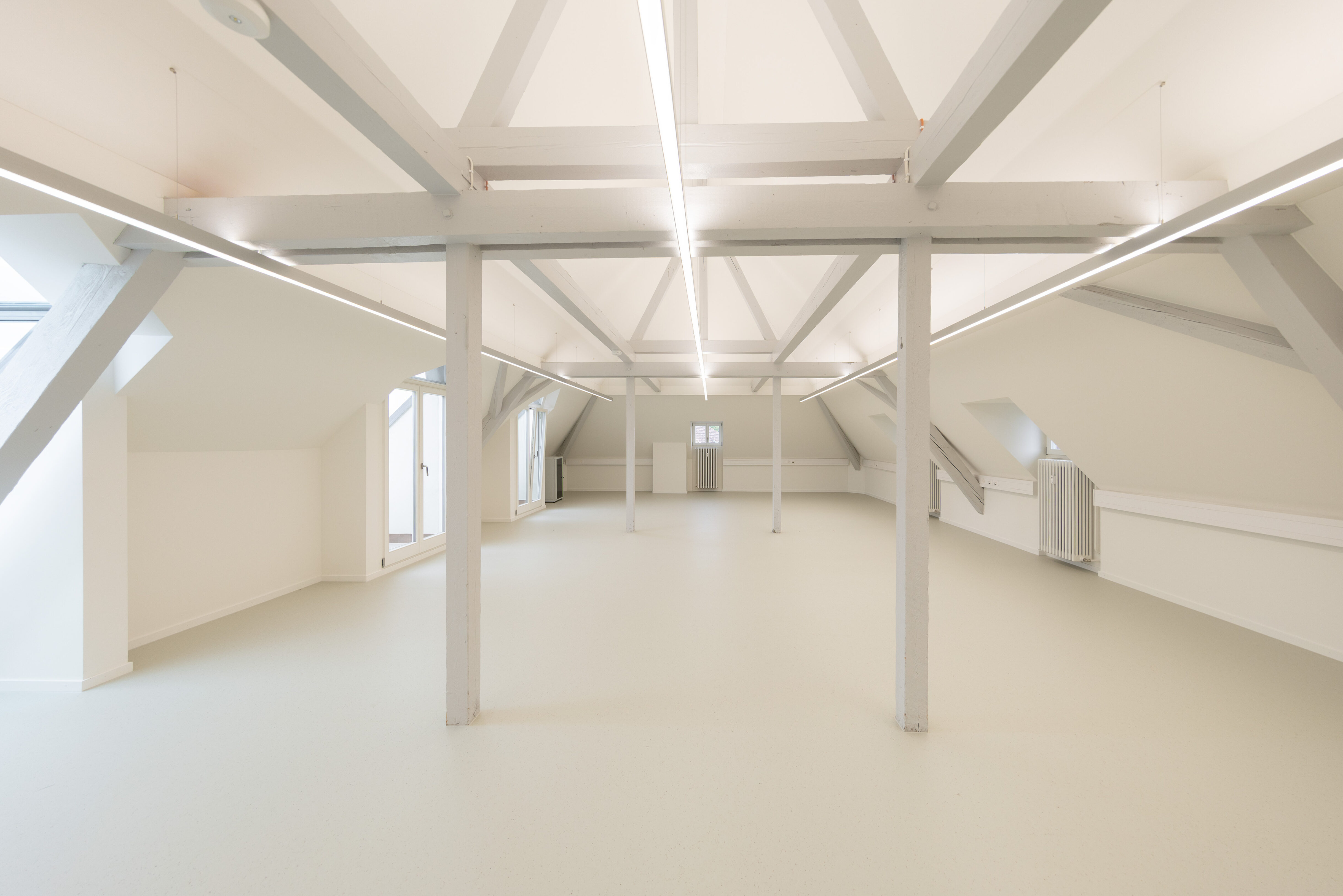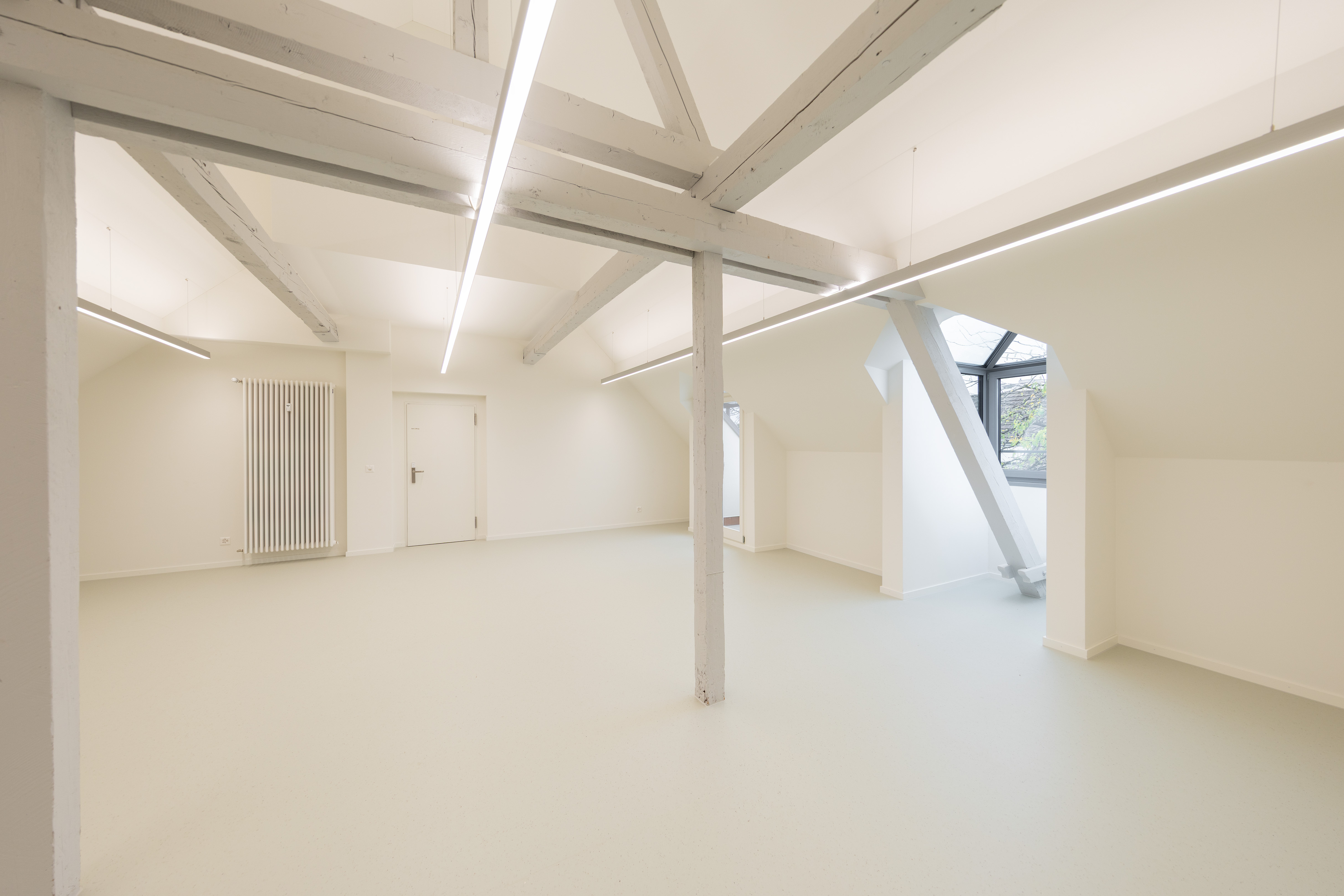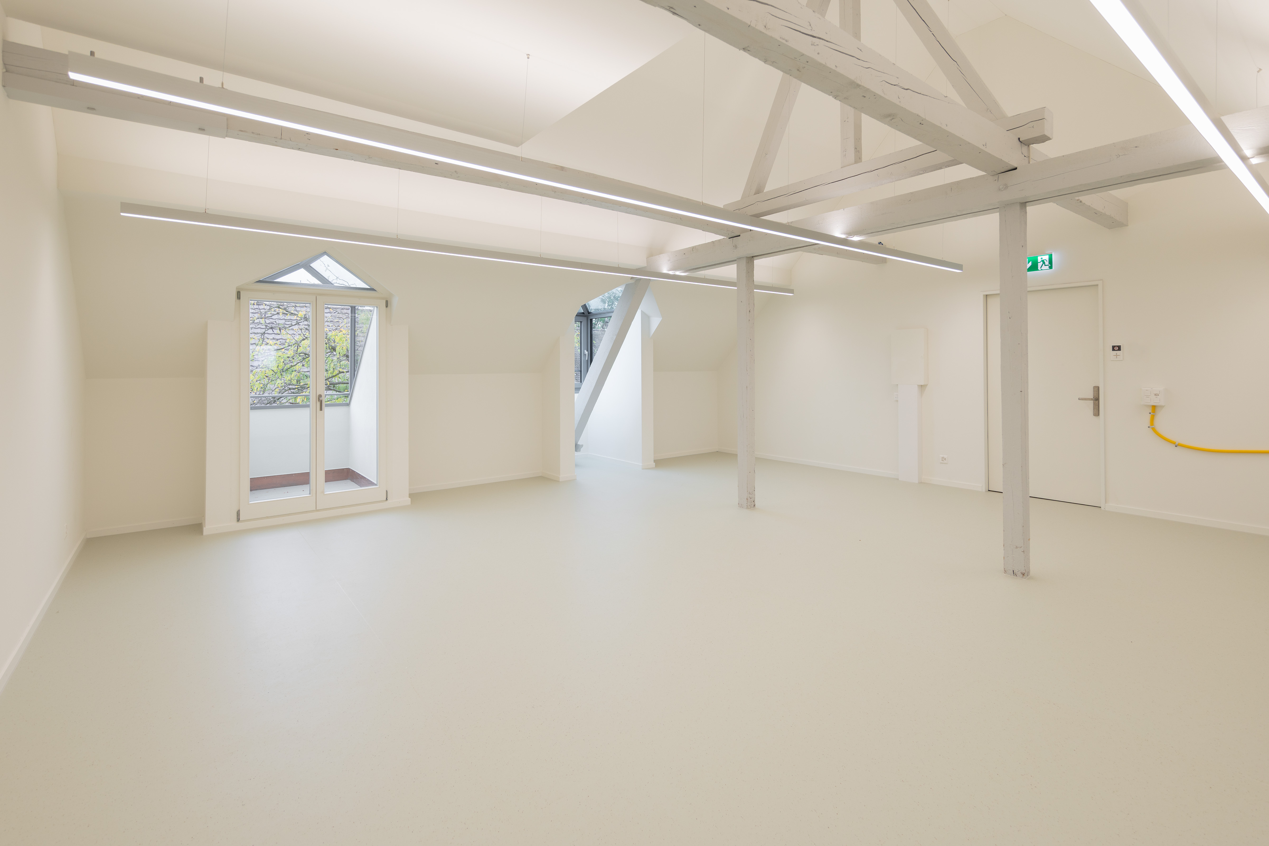 Im Erd- und Dachgeschoss des Hauses sind Gewerberäume zu vermieten. Im Dach stehen zwei Räume à 106 m² und 54 m² zur Verfügung, das Erdgeschoss verfügt über einen Raum à 240 m². Das Angebot richtet sich an stille Gewerbe (Atelier, Praxis, Behandlungsräume etc.), die Teil der Gemeinschaft Socin Haus werden möchten.